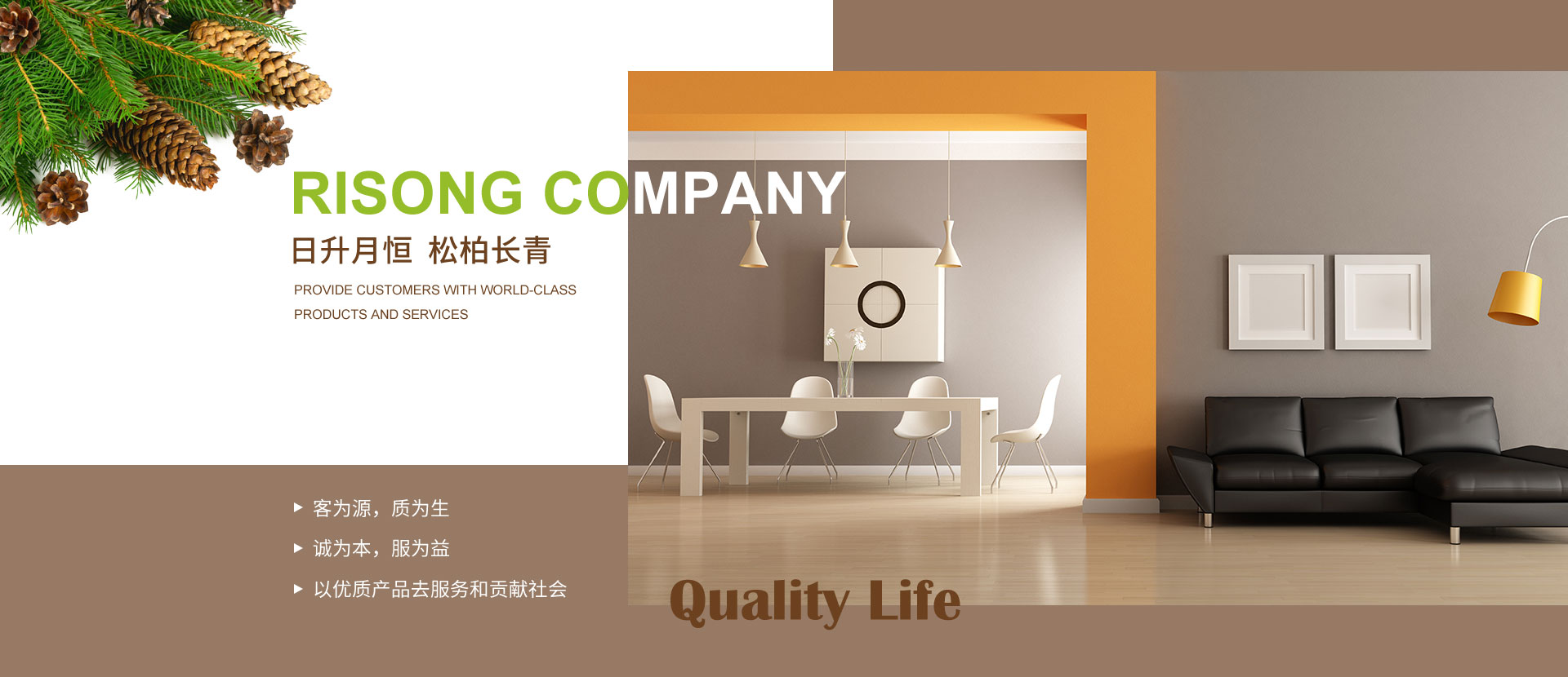 大連日松將一直秉承“以優質產品去服務和貢獻社會”的經營宗旨;“客為源,質為生、誠為本、服為益”的經營理念;達到“使用者、銷售者、制造者”三者并存共榮之經營思路;全體日松人將以“熱情、禮貌、快捷、準確”的行動指南,不懈努力的為每一位客戶,提供行業內一流的高端、環保、舒適、健康的產品和細節服務,打造出適合“您”的優質家居住宅環境。